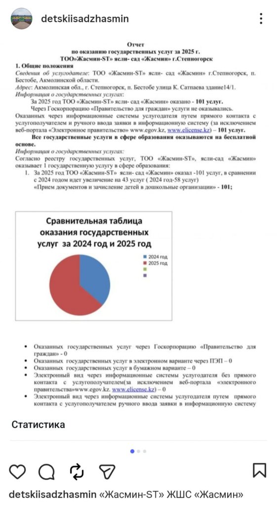 «Жасмин-ST» ЖШС «Жасмин» бөбекжай-бақшасының 2025 жылғы мемлекеттік қызмет көрсету туралы есебі.