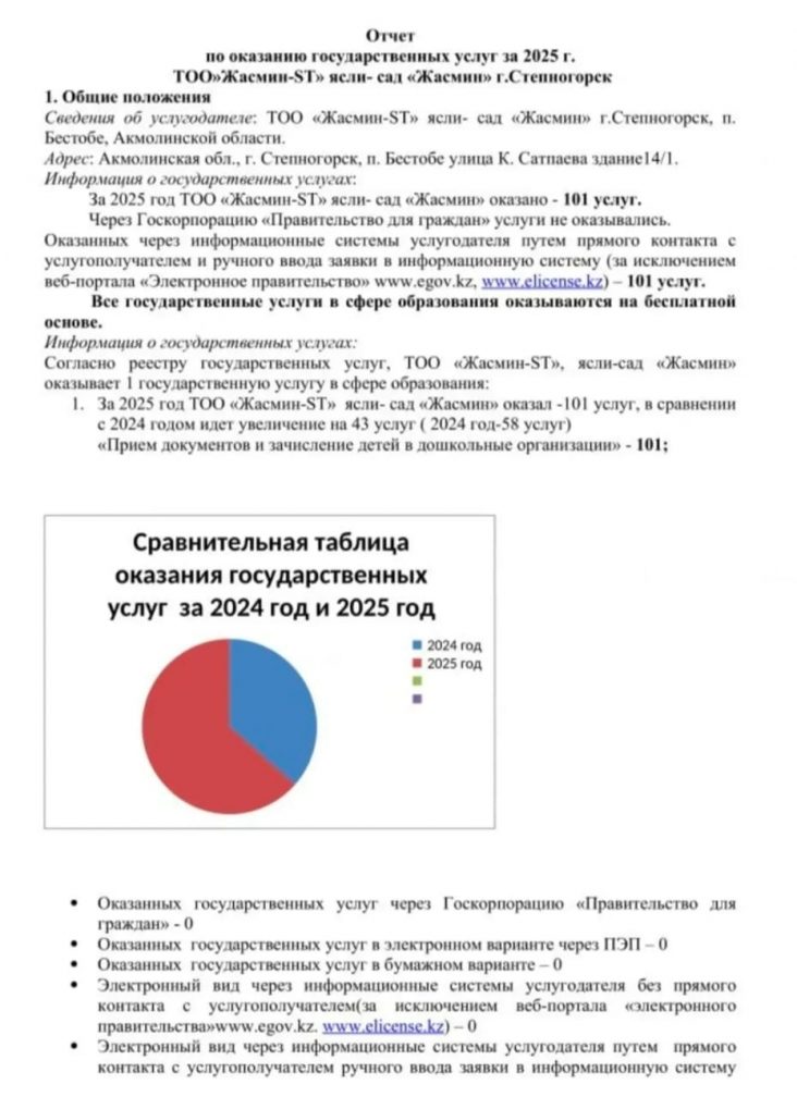 «Жасмин-ST» ЖШС «Жасмин» бөбекжай-бақшасының 2025 жылғы мемлекеттік қызмет көрсету туралы есебі.